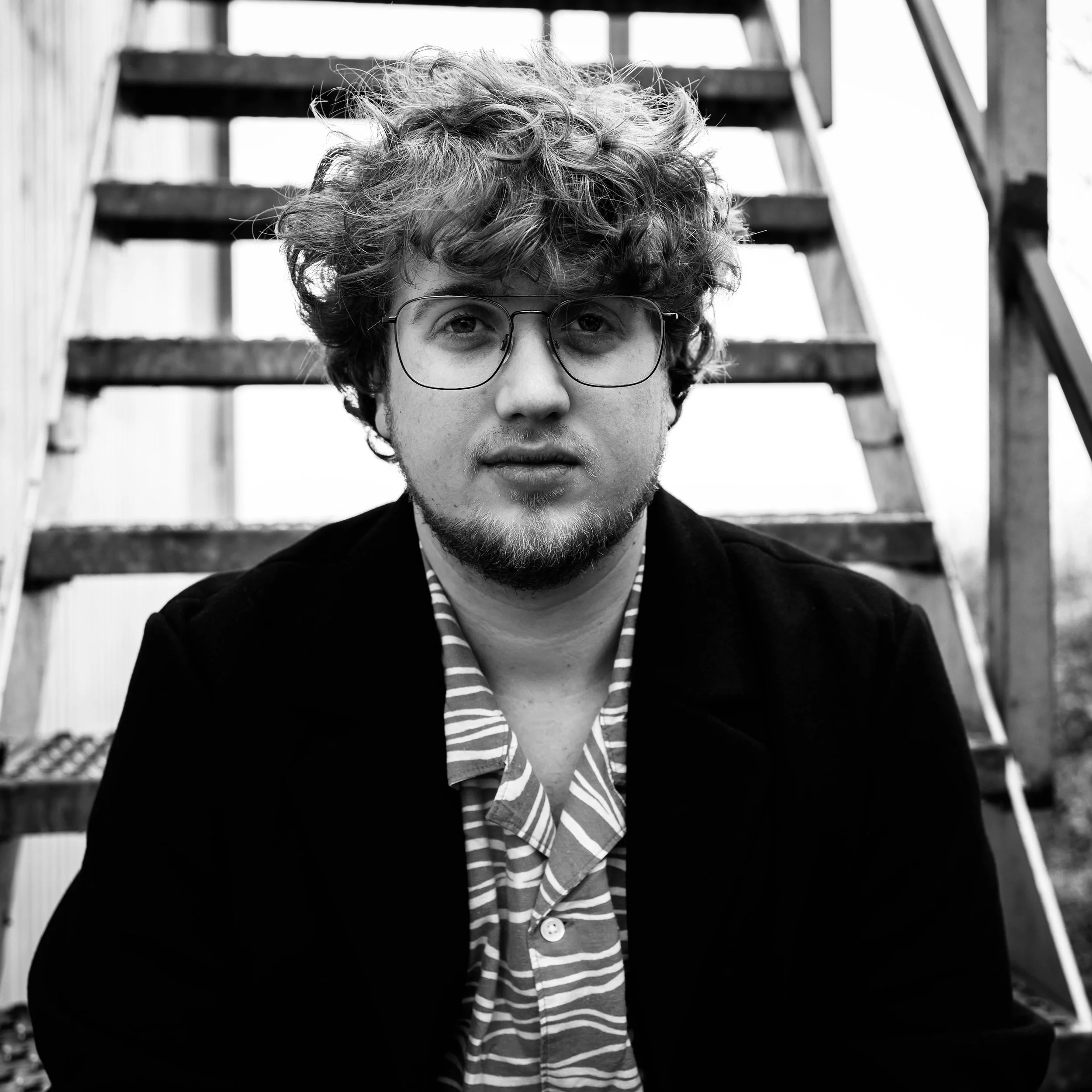 Black and white portrait of a person in a blazer and wide-leg pants, kneeling on the floor with a thoughtful expression.